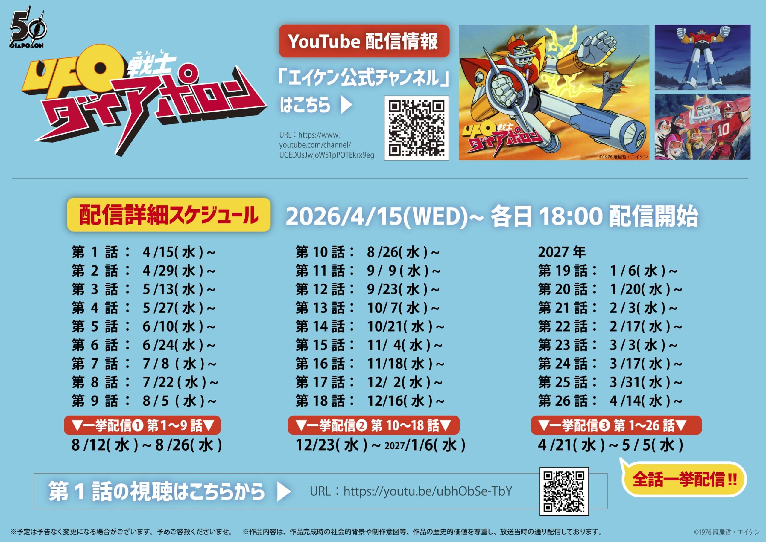 1976 年から放送を開始したアニメ『UFO戦士ダイアポロン』が、今年2026 年に50周年を迎えたことを記念して、YouTube「エイケン公式チャンネル」にてアニメ『UFO戦士ダイアポロン』初の全話無料配信が決定いたしました!